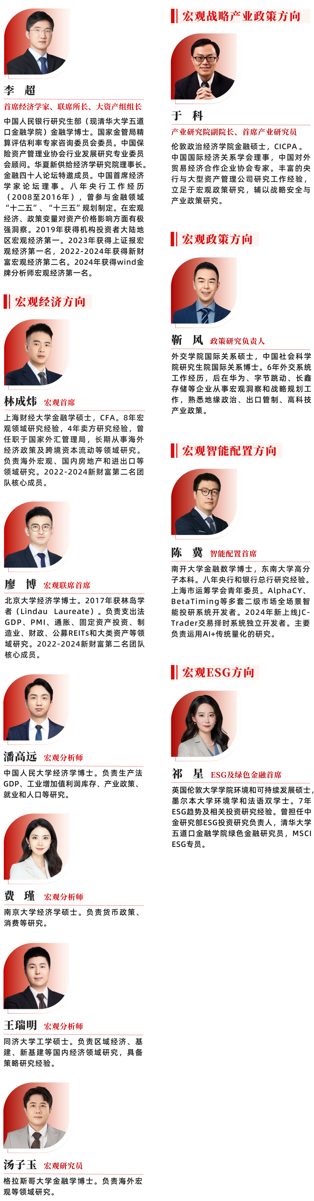 依托核心成员及近半数团队成员的多年政府工作经验,团队对政府部门决策逻辑、政策出台背景及实施节奏具备深刻的切身理解与前瞻判断,是我们在宏观经济与大类资产研究中精准捕捉 “预期差” 的关键。今年团队融合宏观产业、政策、智能配置、ESG方向的顶尖人才丰富研究内容。去年924以来我们多次为客户提供前瞻可靠的深度研究和独具匠心的创新性研究。例如: