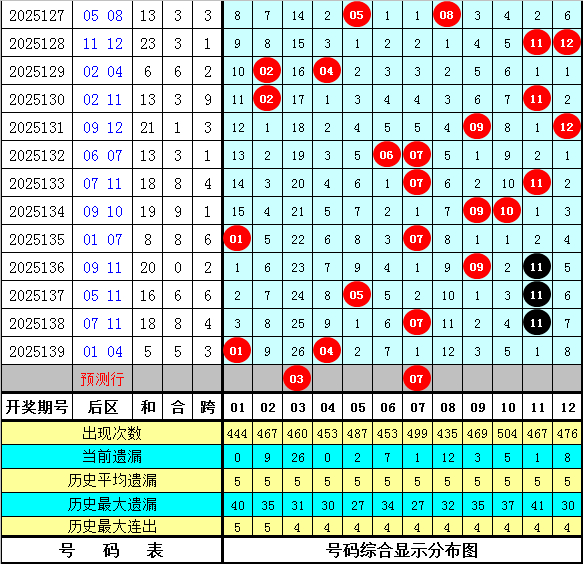 其中,号码奇偶比为50:50,大小比为47:53,012路比为30:30:40,本期前区龙头号码参考04。