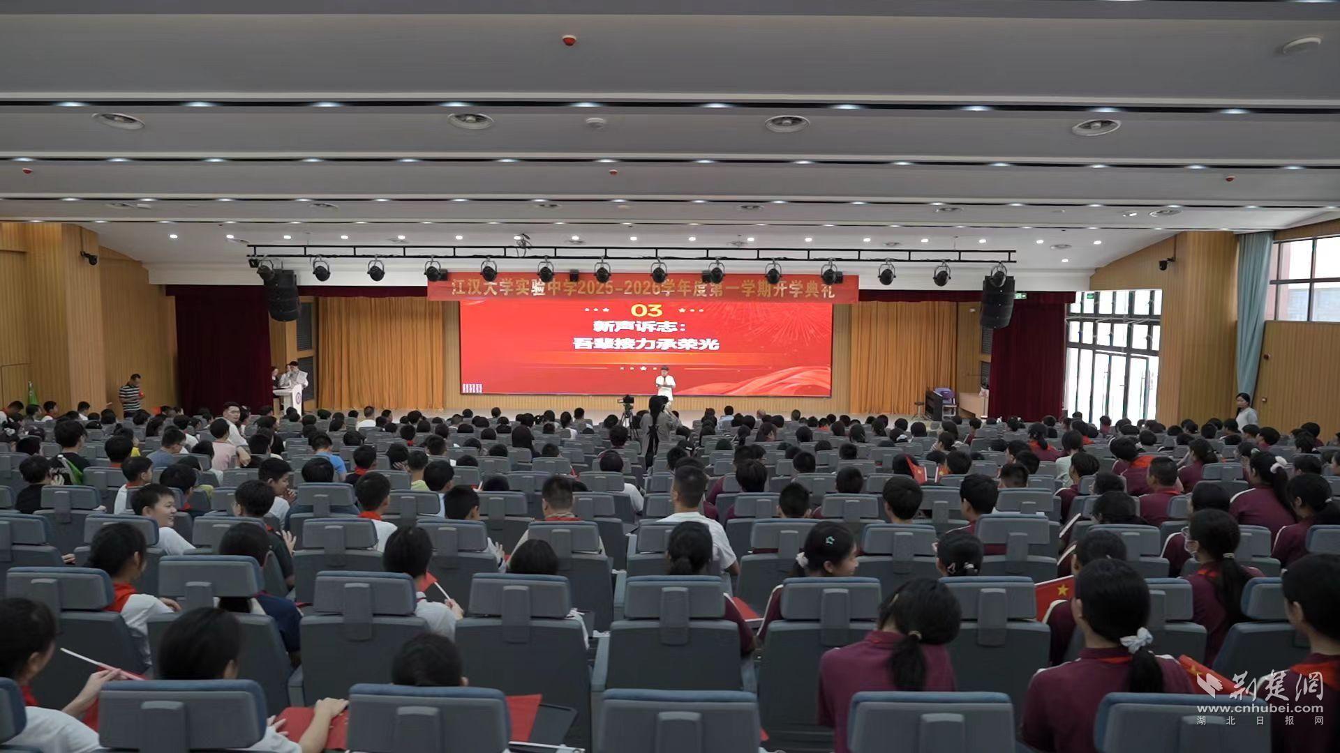 荆楚网(湖北日报网)讯(记者林杉 通讯员王钱花)9月1日,江汉大学实验中学以“传承”为笔,绘下了新学期热烈的开篇。一场隆重的开学典礼,正式开启了2025年秋季学期序幕。活动以传承为主线,将红色信仰、学业理想、师者初心融入仪式与展演之中,展现出学校深厚的文化底蕴与育人力行。