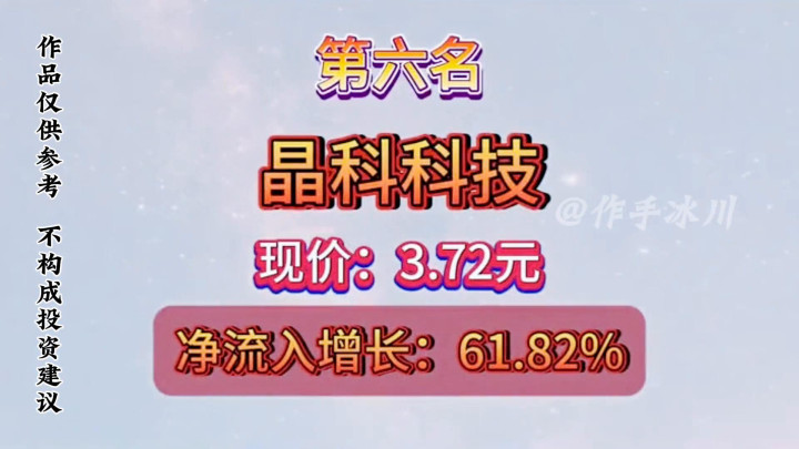 ·第六名:晶科科技,现价:3.72元,净流入增长:2547.13%。
