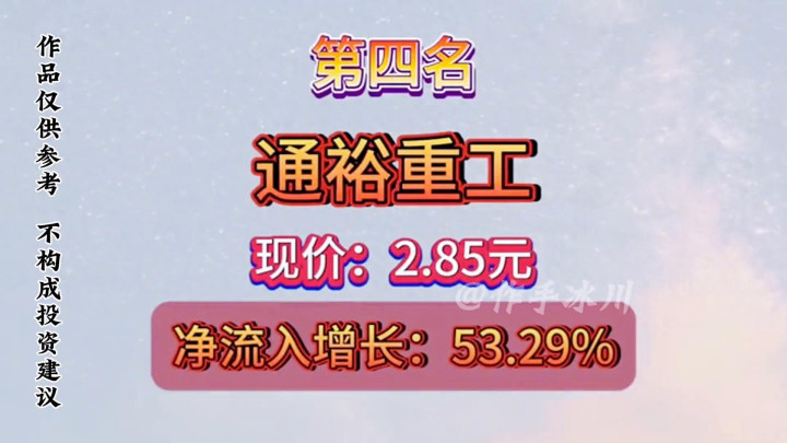 ·第四名:通裕重工,现价:2.85元,净流入增长:53.29%。